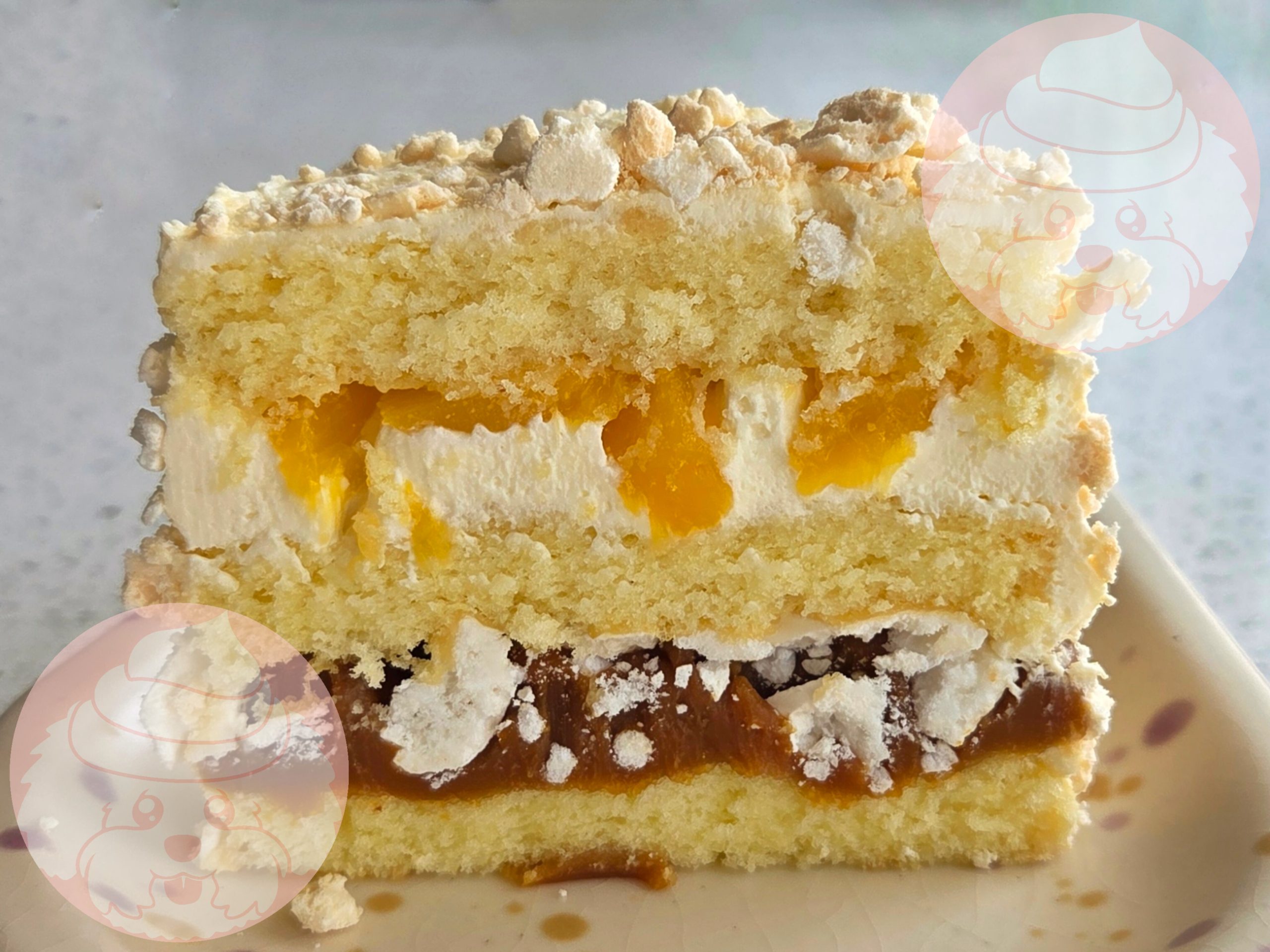 Bizcochuelo de vainilla, dulce de leche, merengue seco, crema batida y durazno. PARA COMPARTIR.